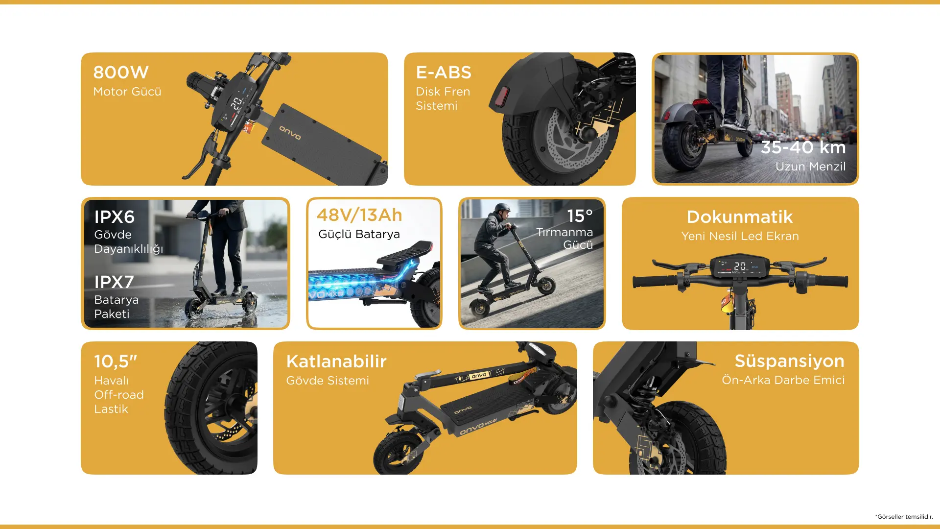 Dayanıklı Yapı ve Akıllı Detaylarla Tanışın Zorlu hava koşullarına karşı IPX7 seviyesinde batarya ve IPX6 seviyesinde gövde korumasıyla donatılan araç, yağmurda veya su birikintilerinde endişesiz bir sürüş imkanı tanıyor. 150 kg’lık yüksek taşıma kapasitesiyle sağlamlığını kanıtlayan şasi yapısı, katlanabilir mekanizması sayesinde saniyeler içinde kompakt bir forma bürünerek her yere kolayca taşınabiliyor. Gece sürüşlerinde görünürlüğünüzü artıran ön aydınlatma, fren lambası ve sinyal sistemleriyle donatılan bu model, teknoloji ve güvenliği tek bir gövdede buluşturuyor.